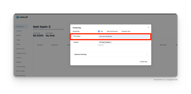 • Create Virtual Key on LiteLLM either through the LiteLLM Admin UI or API